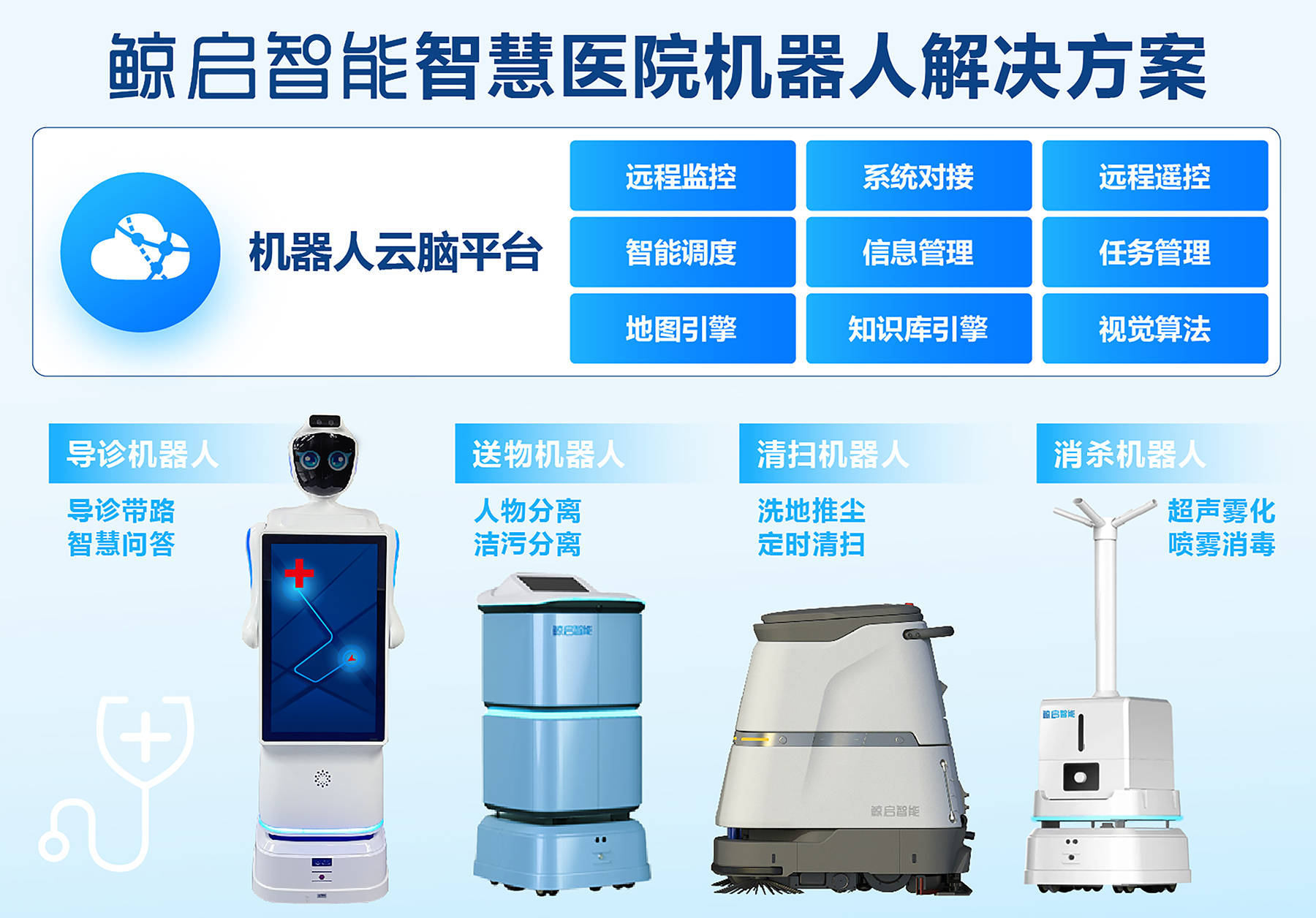 鲸启智能智慧医院机器人解决方案,主要有四类机器人组成:导诊机器人、送物机器人、清扫机器人、消杀机器人。
