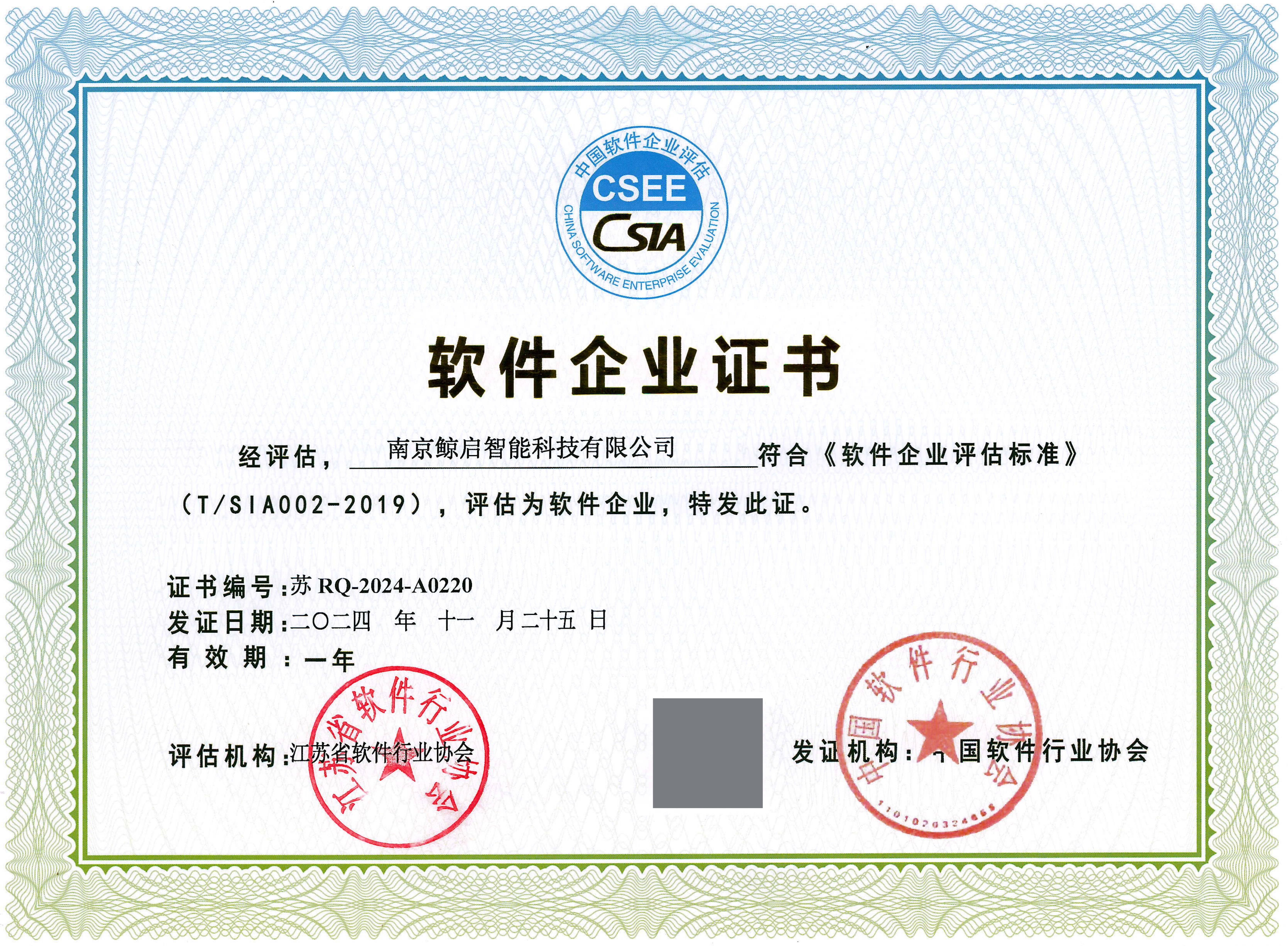 喜报!鲸启智能通过中国软件行业协会双软评估认证